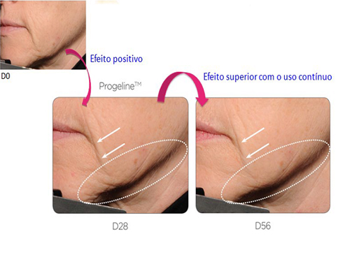 Progeline™ diminui a síntese de progerina, marcador da senescência celular da pele e Progeline™ melhora clinicamente os sinais associados à maturação da pele, como rugas, flacidez, resultando em uma remodelação completa.